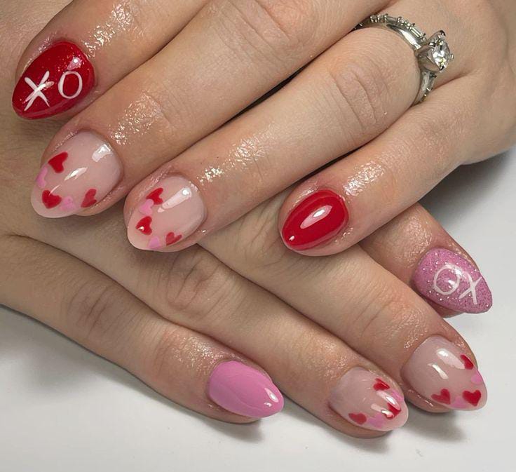 Red, pink, and nude gel short nails are paired with heart accents and subtle “XO” details. The vibe is sweet and flirty Valentine without being too bold.