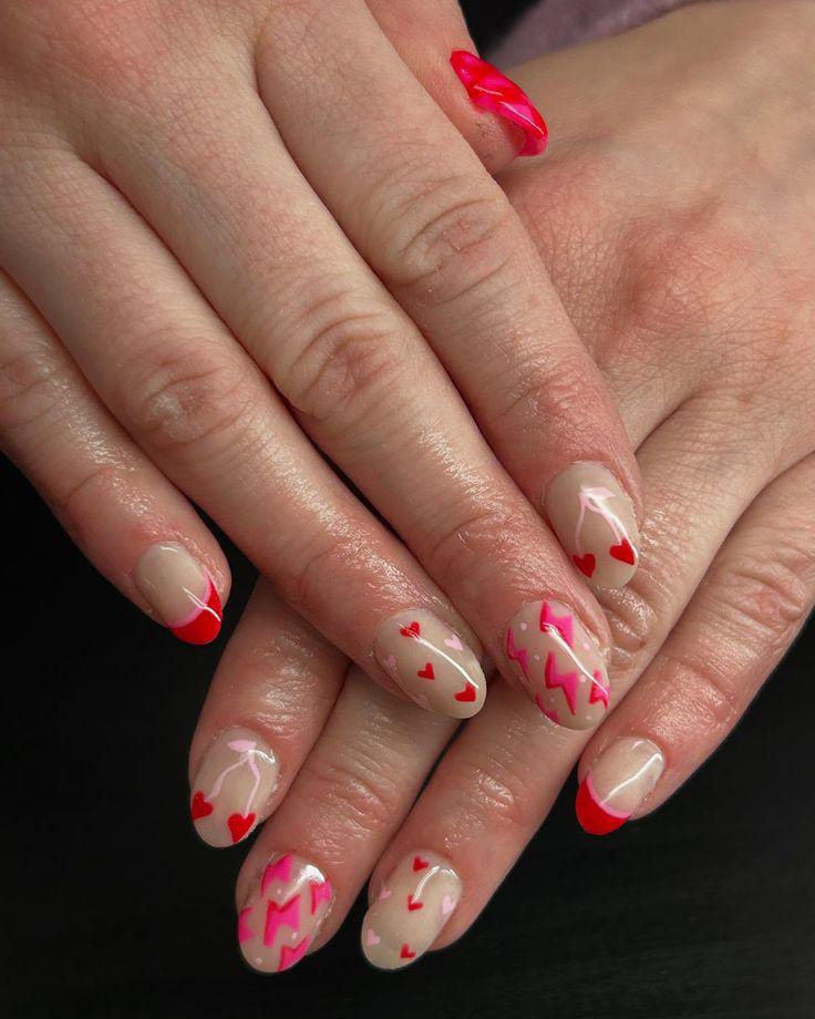 This style combines red, cream nude gel short nail with simple heart patterns. It looks clean, modern, and subtly romantic Valentine without being too bold.