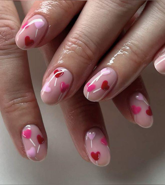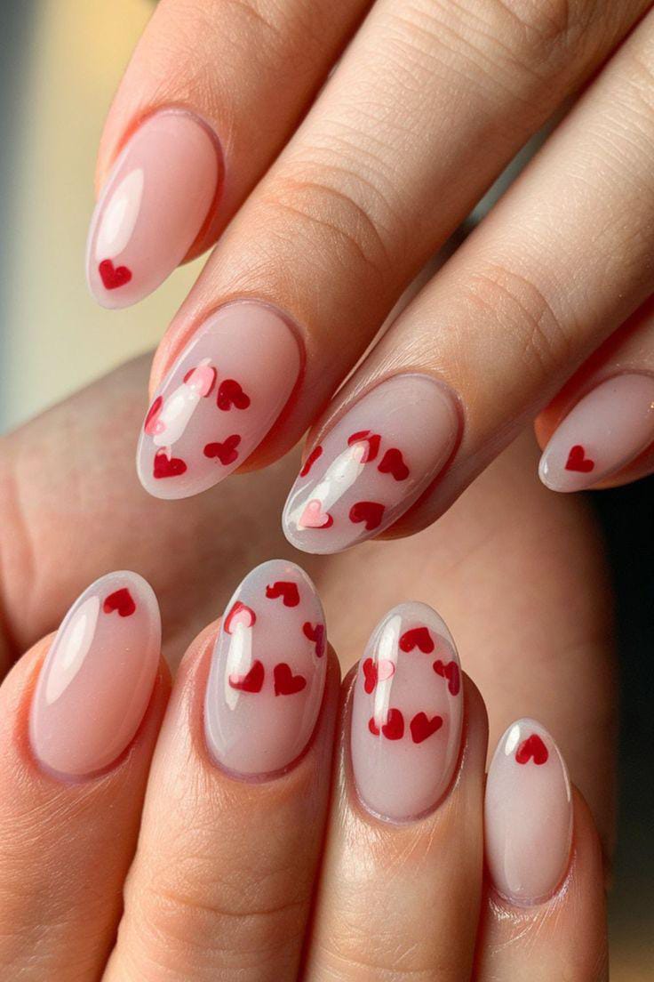 Soft blush and nude gel shades are decorated with scattered heart Valentine patterns. The overall style is delicate, feminine, and effortlessly romantic.