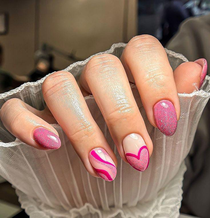 Soft pink and glittery rose pink gel tones mix with flowing heart tip-inspired swirls for a playful Valentine look. The design feels modern, fun, and slightly romantic without being overdone.