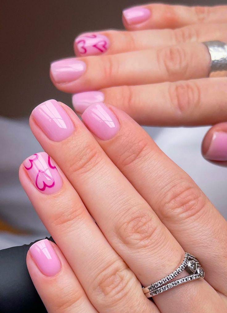 A soft baby-pink gel base with subtle heart line art creates a calm and elegant design. The overall vibe is minimal, feminine, and effortlessly stylish Valentines.
