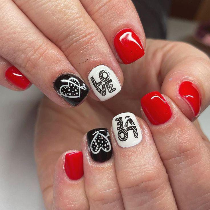 Red, black, and white short nails come together with heart graphics and love-themed text. The design feels bold, expressive, and perfect for making a Valentine statement.