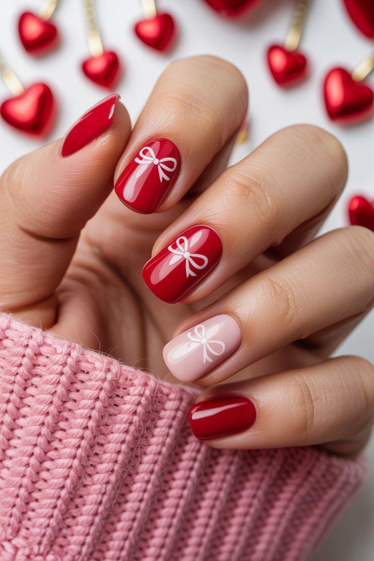 This design mixes glossy red and blush gel short nails with simple white bow accents. It gives a polished, elegant Valentine look with a cozy and charming feel.