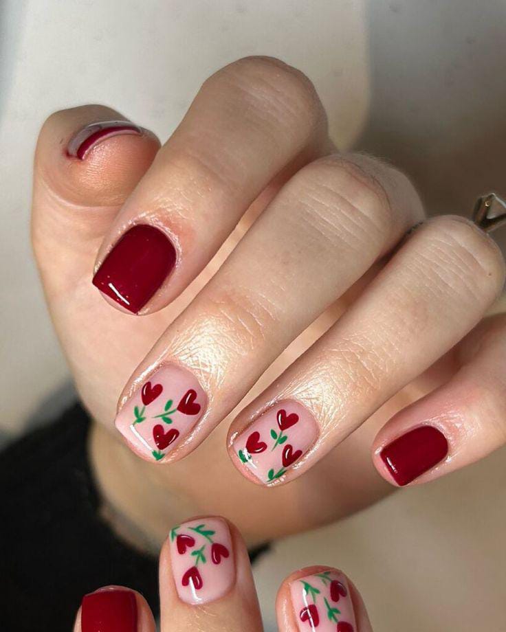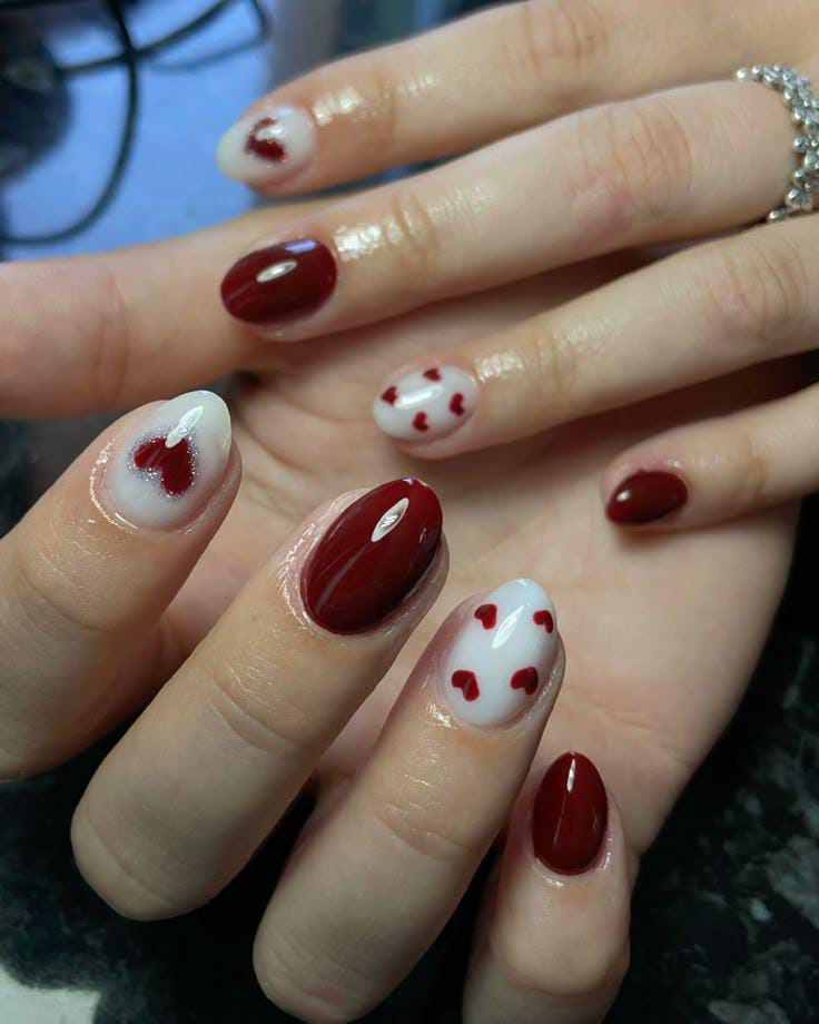Glossy burgundy gel pairs with milky nude short nails decorated with small heart details. The style feels romantic Valentine and polished without being too bold.