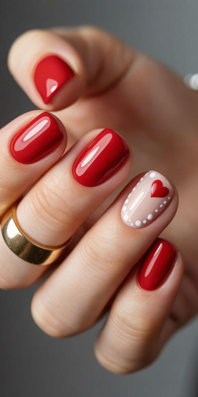 Bold red gel short nails are balanced with a single soft nude accent nail featuring a heart and dots. The look is timeless, elegant, and perfect for a minimalist Valentine style.