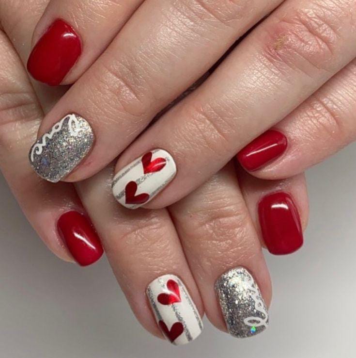 Bold gel red short nails are paired with silver glitter and white accent nails featuring hearts. The overall vibe is classy with a festive Valentine sparkle.