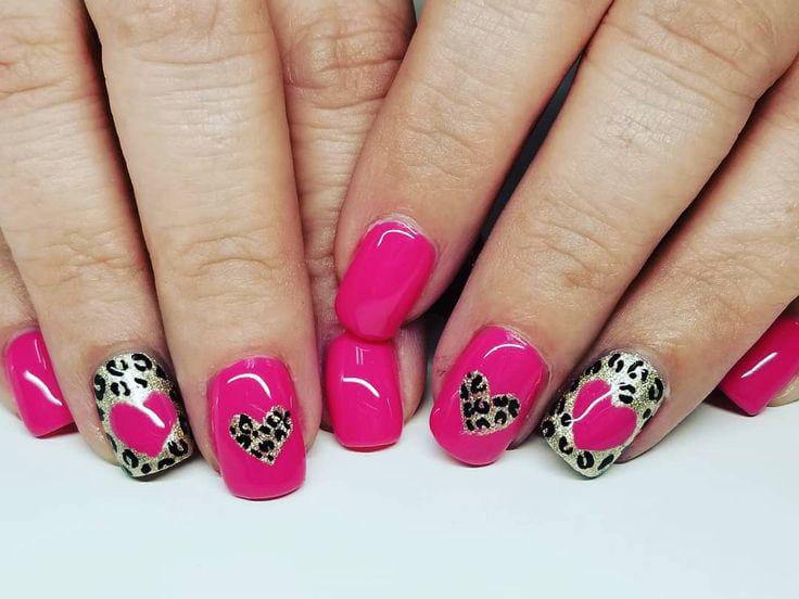 Bright pink gel short nails stand out with leopard-print heart accents. This look is fun, bold, and perfect for a modern Valentine statement.