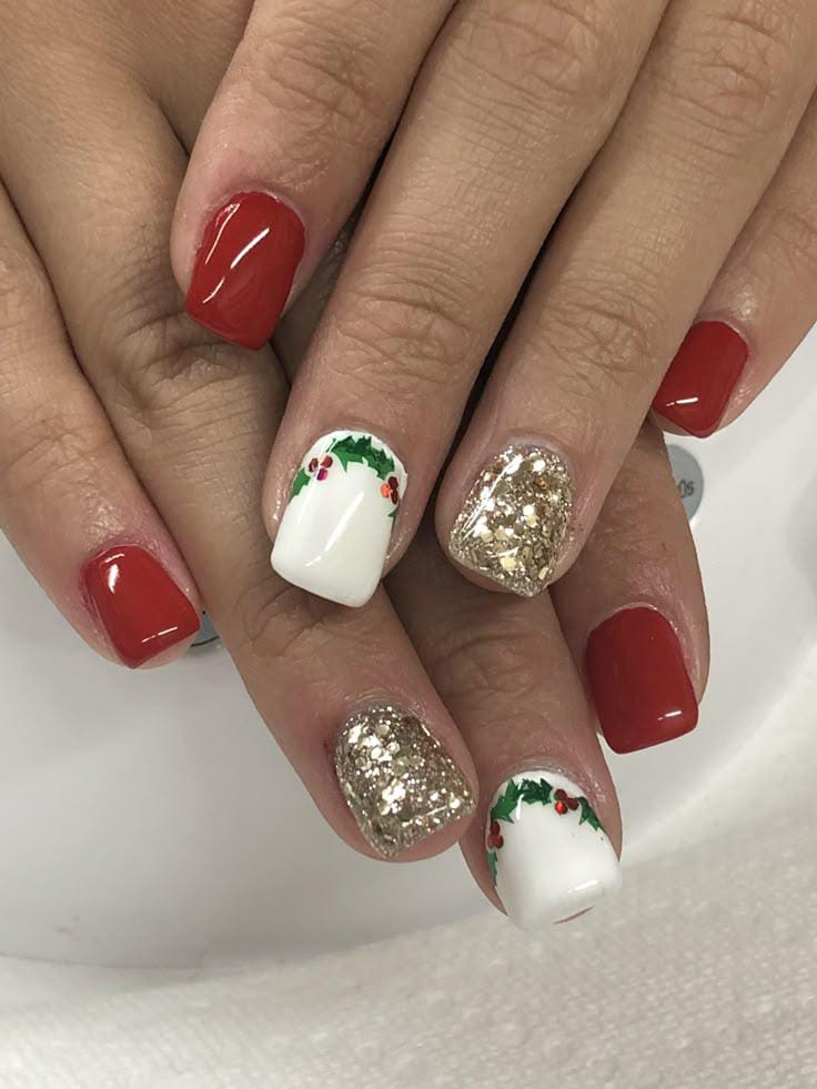 This set blends bold red nails with white holly-accented nails and chunky gold glitter, giving a classic Christmas feel. The mix of glossy color, sparkle, and simple art keeps the design fun, bright, and perfectly festive.