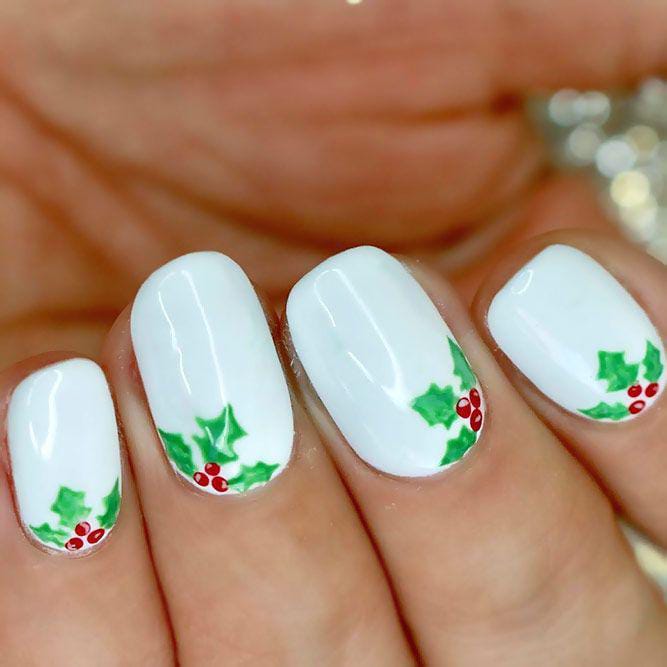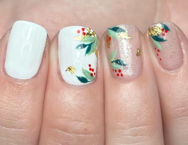 This design mixes soft white and sheer nude tones with hand-painted green leaves, tiny red berries, and touches of gold foil for a delicate, festive look. It feels elegant Christmas and slightly whimsical without being too bold.