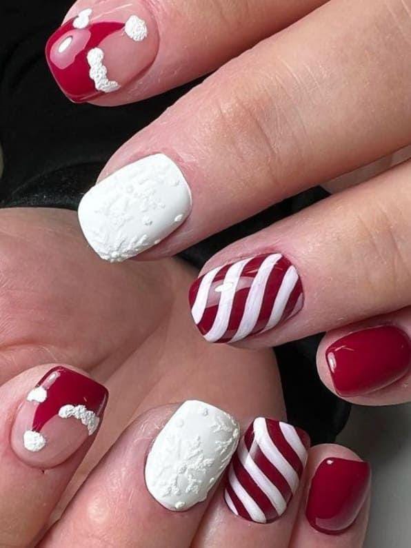 A mix of deep red, pure white, and textured snowy accents creates a playful winter look, complete with candy-cane stripes and soft snow-like designs. It’s a bold yet cozy Christmas mix.