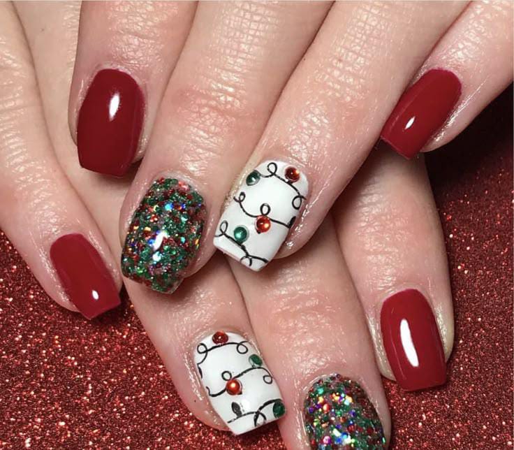 Rich red nails are paired with sparkling green glitter and white accent nails decorated with whimsical Christmas lights. The combo feels cheerful, sparkly, and full of holiday spirit.