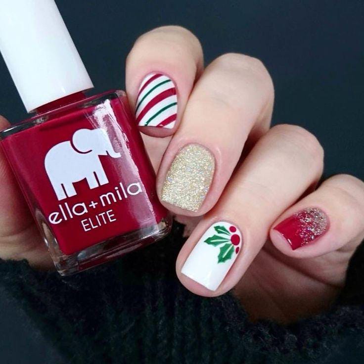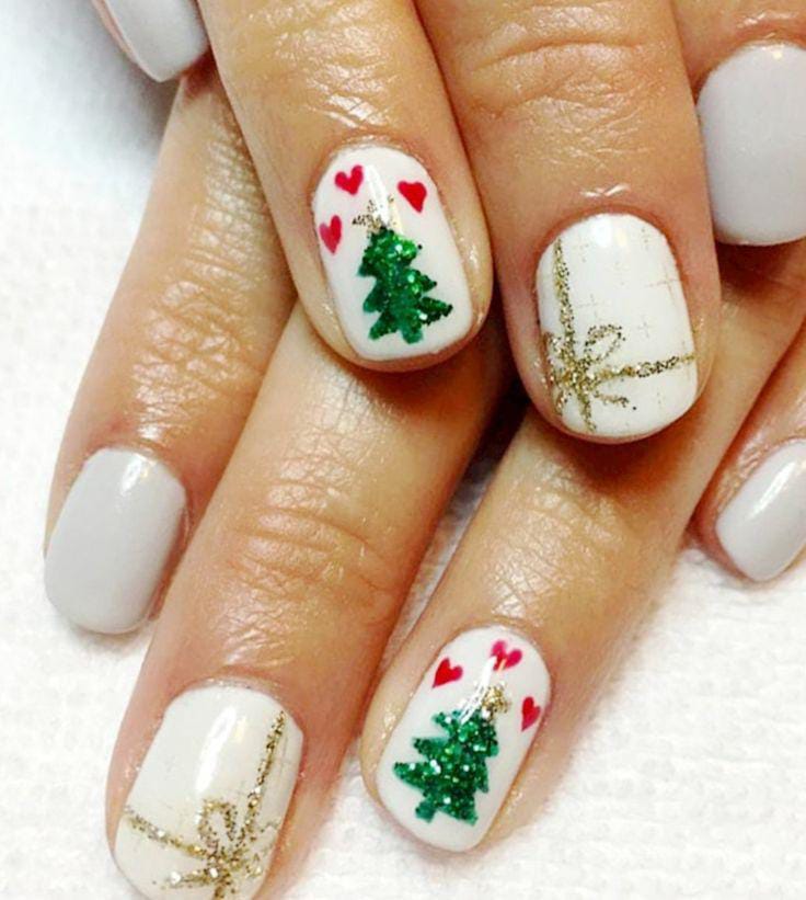 Glittery red and green nails pair with playful white accents featuring a tree, wreath, and candy-cane stripes for a fun, traditional Christmas vibe.