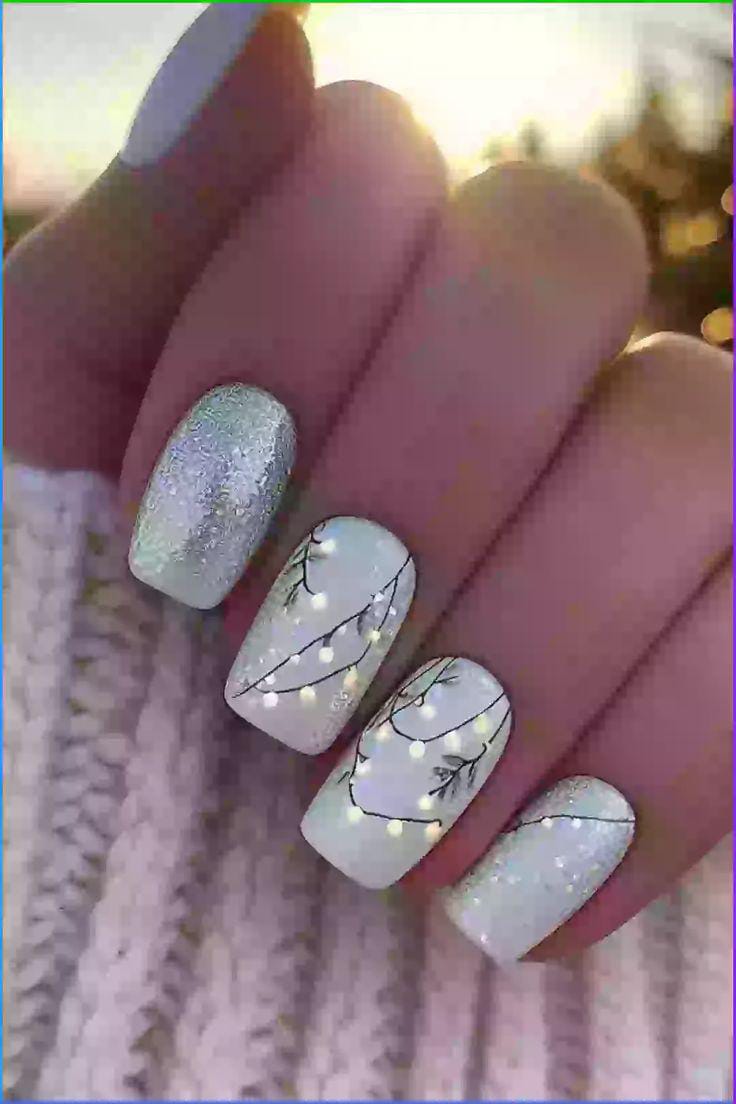Soft white nails are topped with shimmery silver and delicate string-light designs, creating a dreamy winter-wonderland Christmas effect. It’s elegant, glowing, and beautifully wintry.