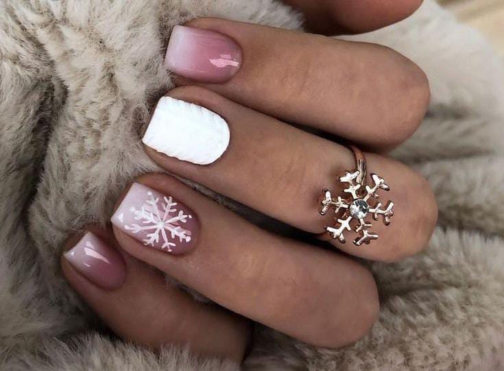 This design mixes soft pink ombré nails with a textured white “sweater knit” accent and delicate snowflake art for a cozy, winter-chic Christmas look.