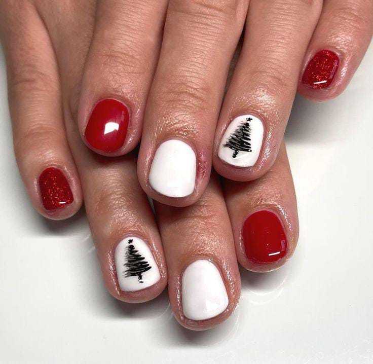 A bold blend of glossy red and crisp white nails, finished with simple black Christmas tree sketches, gives this look a timeless Christmas charm.