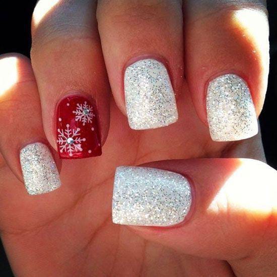 Bright white glitter nails create a snowy, shimmering look, paired with a bold red accent nail featuring hand-painted snowflakes for a classic Christmas contrast.
