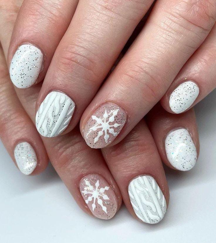 This set combines snowy white glitter nails with raised cable-knit textures and bold white snowflakes, offering a frosty, textured winter Christmas vibe.