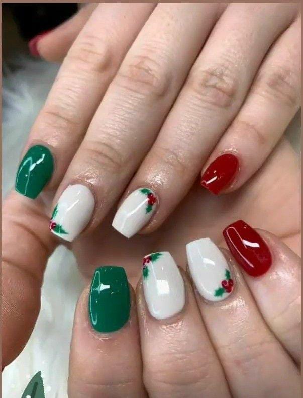 This design mixes crisp white nails with bright red and green accents, featuring tiny holly leaf details that give it a soft, cheerful Christmas vibe. The mix of bold solids and subtle art keeps it playful but classy.