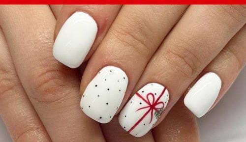 Clean white nails paired with small black speckles and a red ribbon accent create a simple, snowy look with a cute Christmas present-themed twist. It feels minimal but still festive and fun.