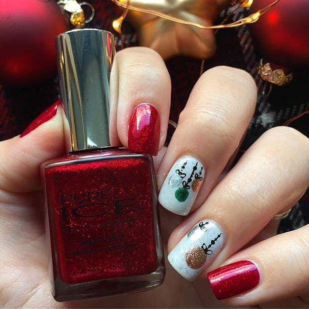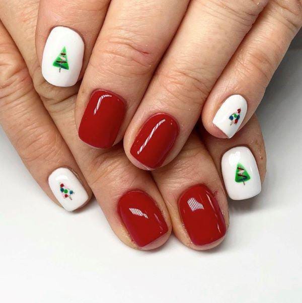 A bold red polish is balanced with white nails decorated with tiny Christmas trees and holly motifs, giving a cozy, traditional holiday feel. The look is simple but instantly festive.