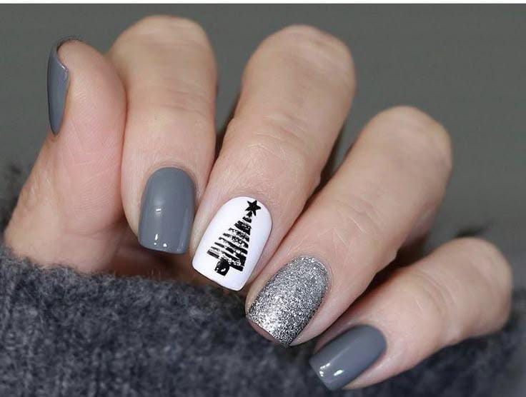 Soft grey nails are elevated with a white accent nail featuring a modern black Christmas tree and a full silver-glitter nail, creating a chic, wintry feel. It’s understated but stylish with a touch of sparkle.