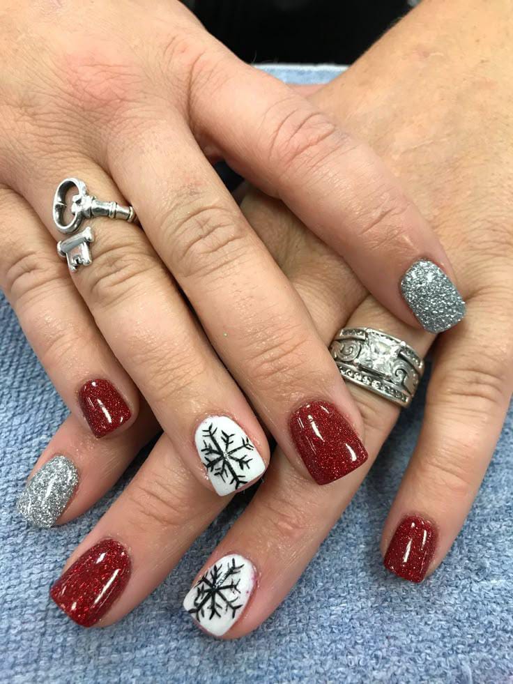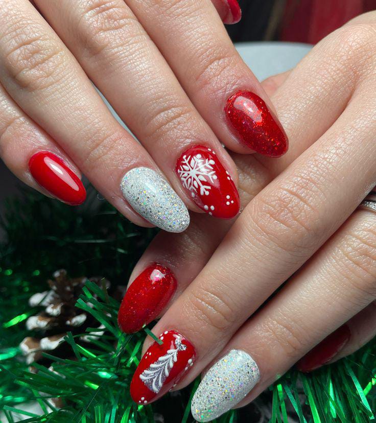 This design blends deep red nails with white snowflake accents, paired with a crisp white nail and a silver-glitter accent for a festive, cozy Christmas feel.
