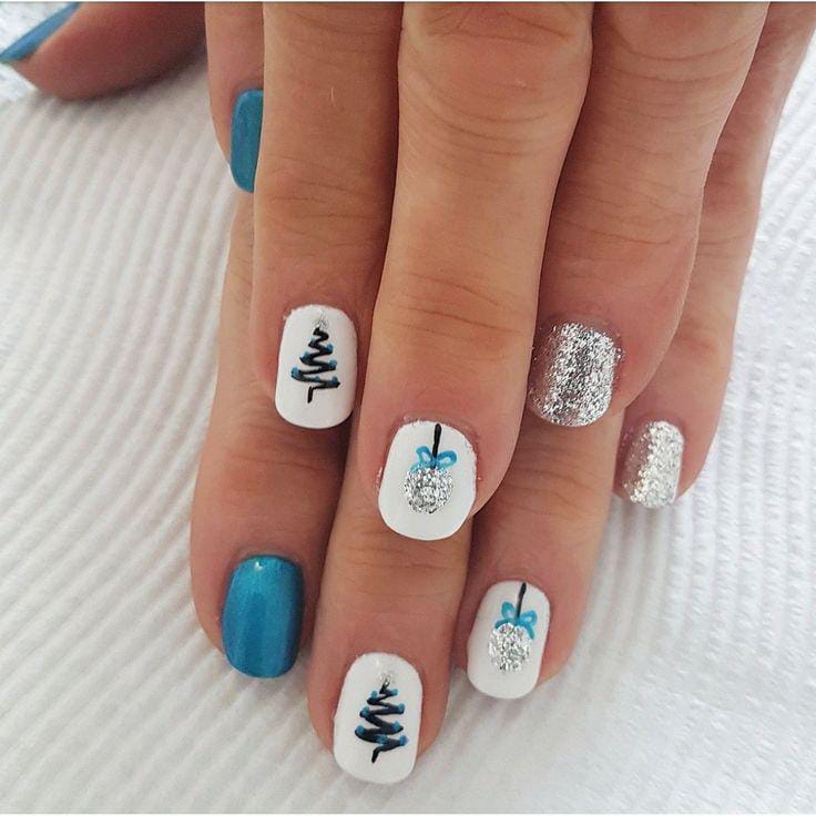 This design mixes crisp white nails with simple blue Christmas tree and ornament accents, paired with metallic silver glitter and icy blue polish for a fresh winter look.