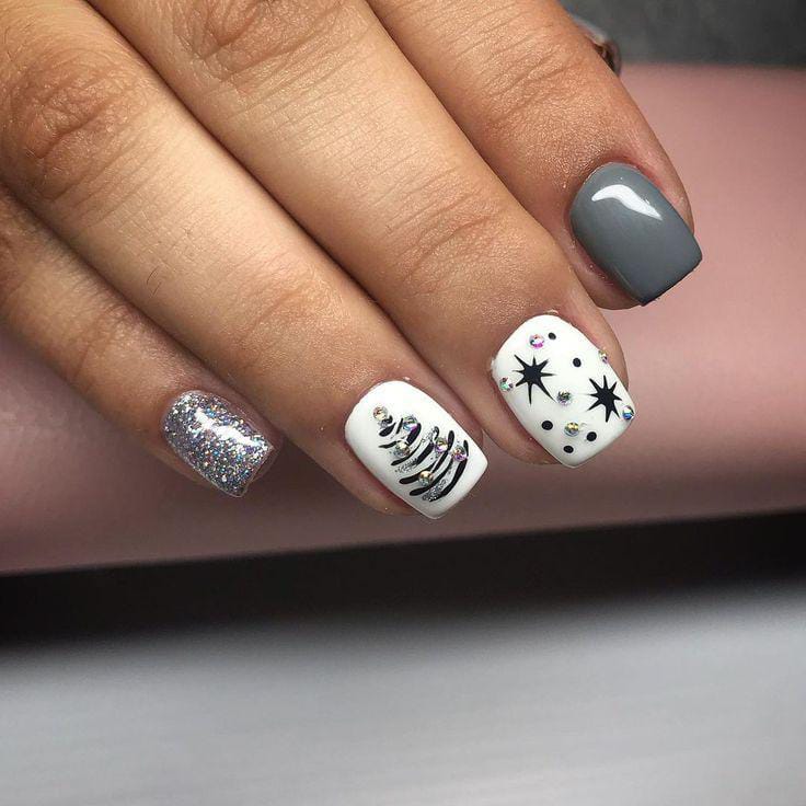 A clean white base highlights sleek black Christmas tree silhouettes and star accents, balanced with glossy grey polish and a pop of silver glitter for a modern holiday vibe.