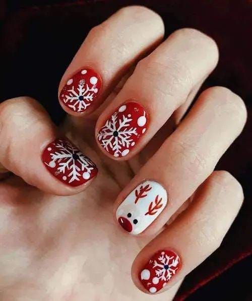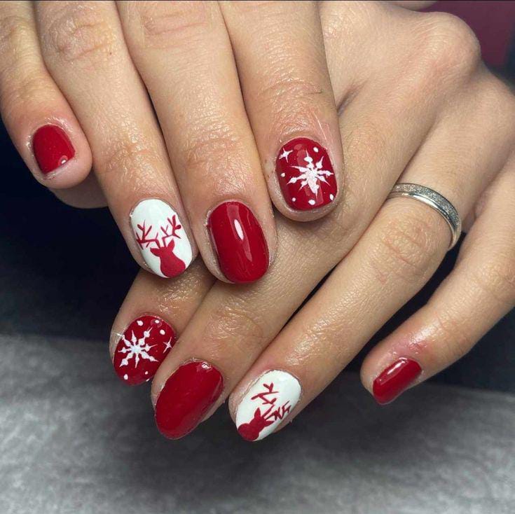 Bold red nails are paired with white accent nails featuring reindeer silhouettes and snowflakes, giving the design a cheerful and traditional Christmas feel.