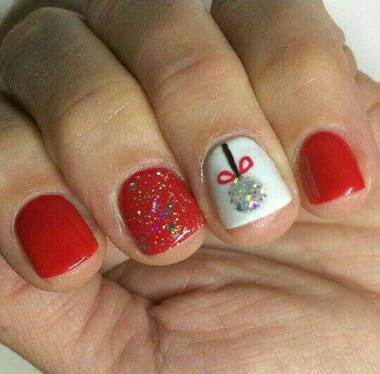 A mix of glossy red nails and a sparkly red accent nail is complemented by a white nail featuring a tiny ornament design, giving this look a playful Christmas holiday feel.