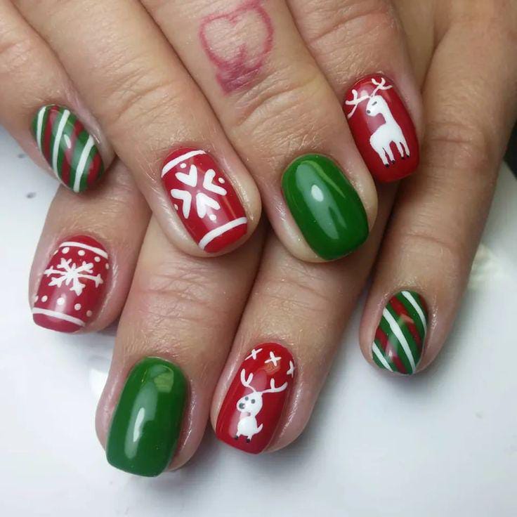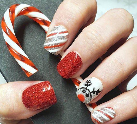 Shiny red and white nails are paired with candy-cane stripes and cute reindeer accent nails, creating a fun, cheerful Christmas theme with plenty of character.