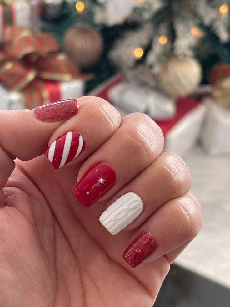 A mix of red glitter, candy-cane stripes, a glossy red star accent, and a textured white knit-sweater nail gives this look a playful yet warm Christmas holiday vibe.
