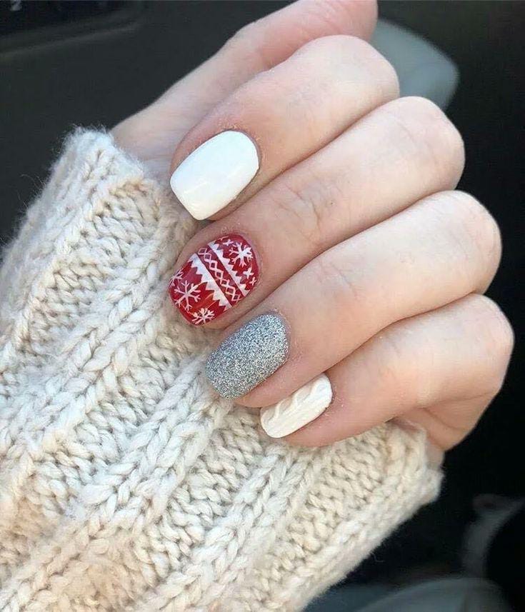 Bright white nails are paired with a red Nordic sweater pattern and a silver-glitter accent, creating a clean, wintry look inspired by classic Christmas sweaters.