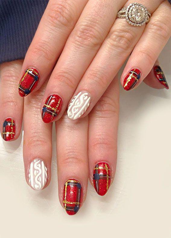 Red glitter nails with navy and gold plaid details are balanced by a white knit-style accent nail, giving the design a rich, traditional Christmas holiday feel.