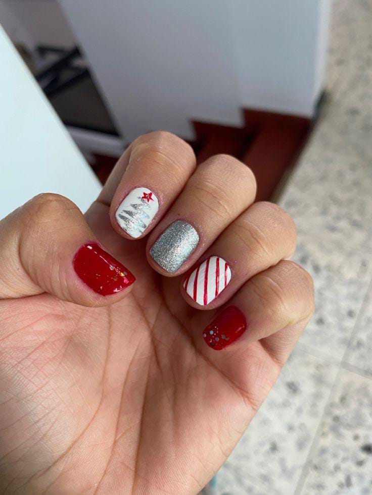 A soft blend of red nails, a silver-glitter accent, candy-cane stripes, and a white Christmas-tree accent keeps the design cheerful, bright, and perfectly Christmas-ready.