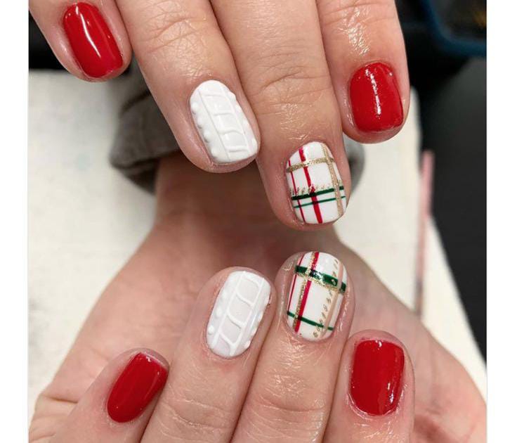 This design mixes bright red polish with textured white “sweater” nails and festive plaid accents for a cute, warm Christmas look.