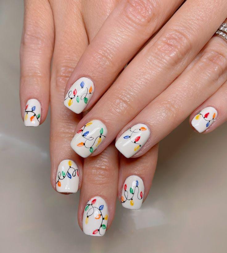 A crisp white base decorated with colorful string-light doodles creates a cheerful, whimsical Christmas holiday look that feels bright and festive.