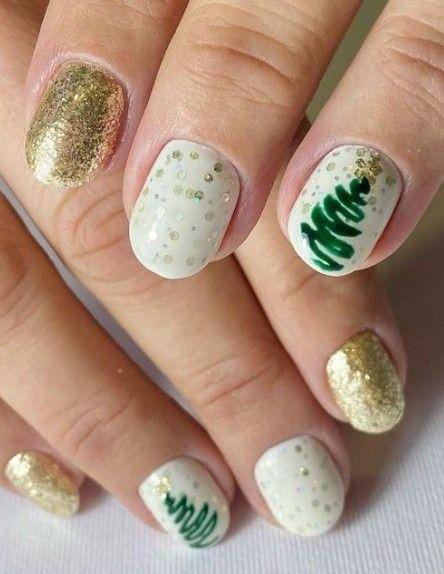 Sparkly gold nails blend with soft white and light gold dotting, topped off with simple green Christmas-tree designs for an elegant yet cozy winter feel.