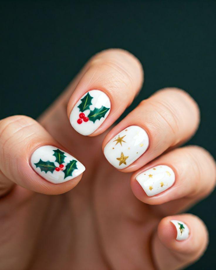 Bright white nails decorated with classic holly leaves, red berries, and scattered gold stars create a clean, cheerful Christmas vibe. The simple artwork makes the design playful yet polished.