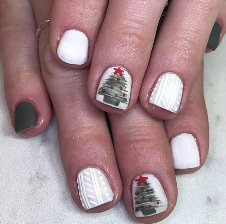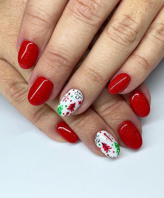 Bold red nails are paired with white accent nails featuring playful Christmas trees, dots, and greenery, creating a lively holiday contrast. The combination feels bright, traditional, and full of Christmas spirit.