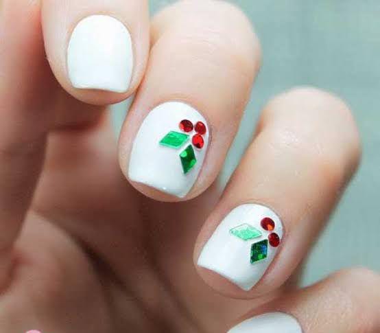 White nails get a fun upgrade with tiny red and green rhinestones arranged like holly leaves and berries. The clean base and glossy finish keep the design simple, fresh, and sparkly Christmas.