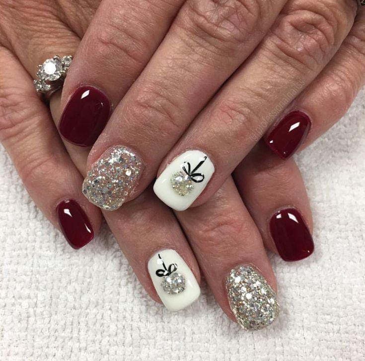 Deep burgundy nails combine beautifully with silver-glitter accents and white nails adorned with tiny gift-box art, blending elegance with Christmas festive sparkle.