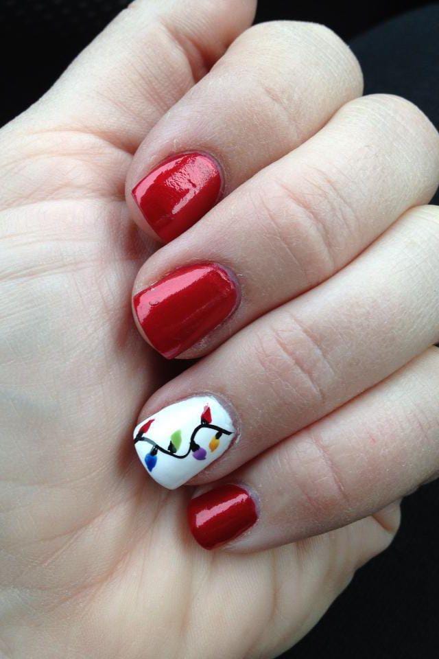 Glossy red nails are paired with one white accent nail painted with colorful Christmas string lights for a playful, simple holiday vibe. It balances traditional color with a fun, nostalgic touch.