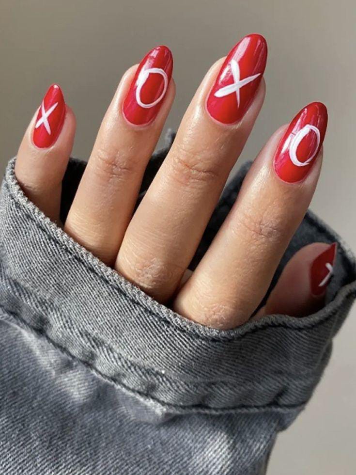 Bold red nails are decorated with simple white “XO” lettering for a playful Valentine theme. The look is fun, eye-catching, and still easy to wear.