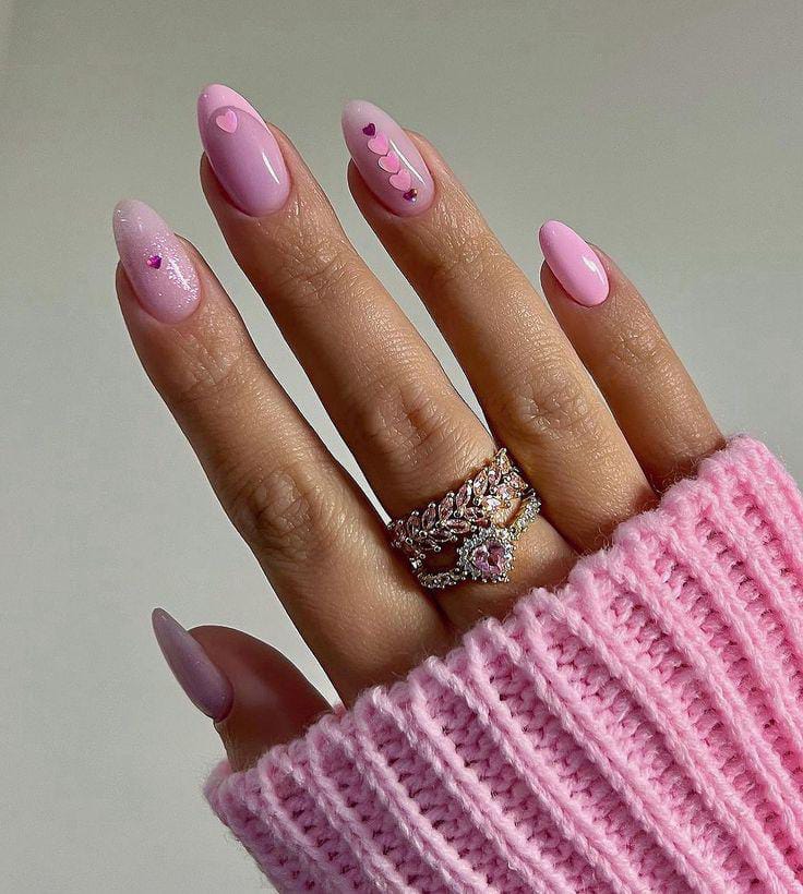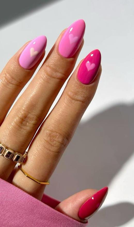 These almond nails feature a soft pink, bright pink gradient with subtle heart accents for a sweet, romantic Valentine’s feel. The glossy finish keeps the look simple yet polished.