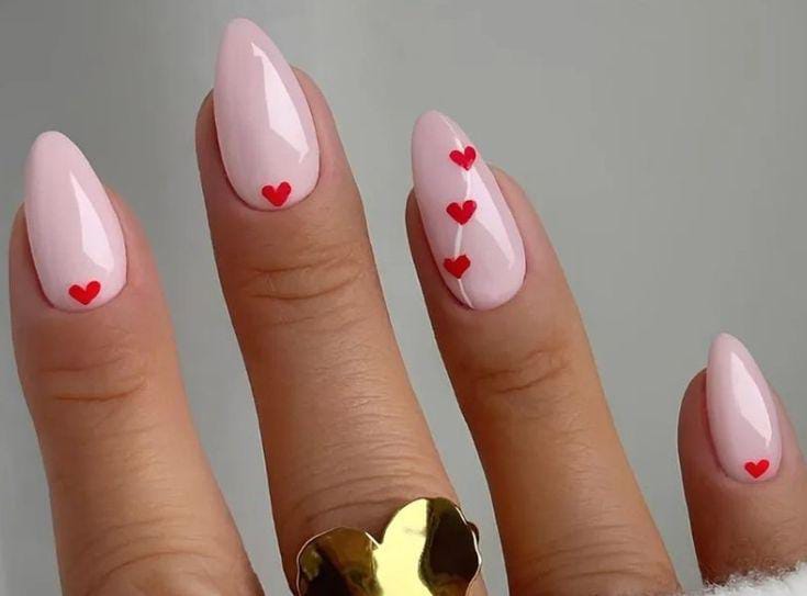 A sheer blush base is paired with small red heart details on select nails. The design feels clean, modern, and perfect for simple Valentine style.