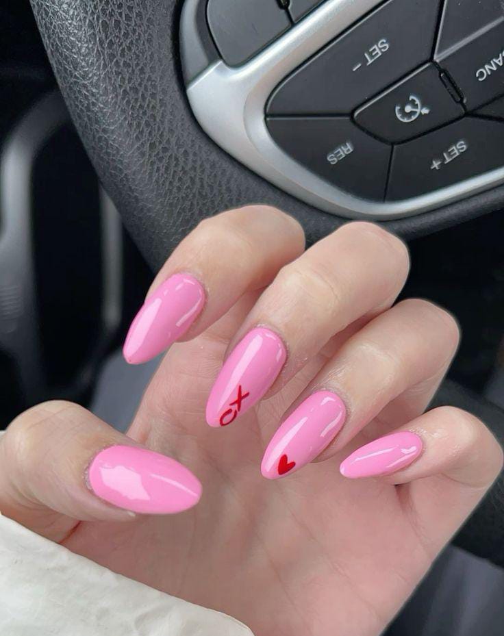Glossy pink almond nails feature tiny red Xo and heart symbols for a fun Valentine accent. The overall style is simple, polished, and charming.