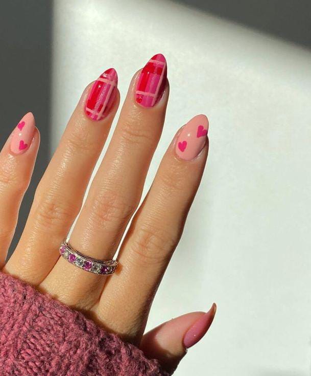 Soft pink almond nails feature tiny heart accents and a subtle plaid pattern in deeper pink tones. The look feels cozy, playful, and perfect for a simple Valentine vibe.