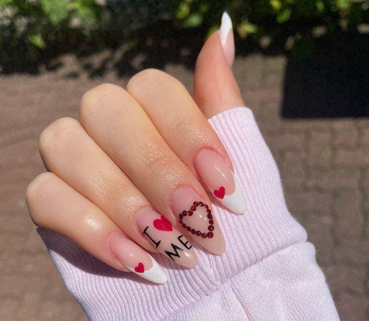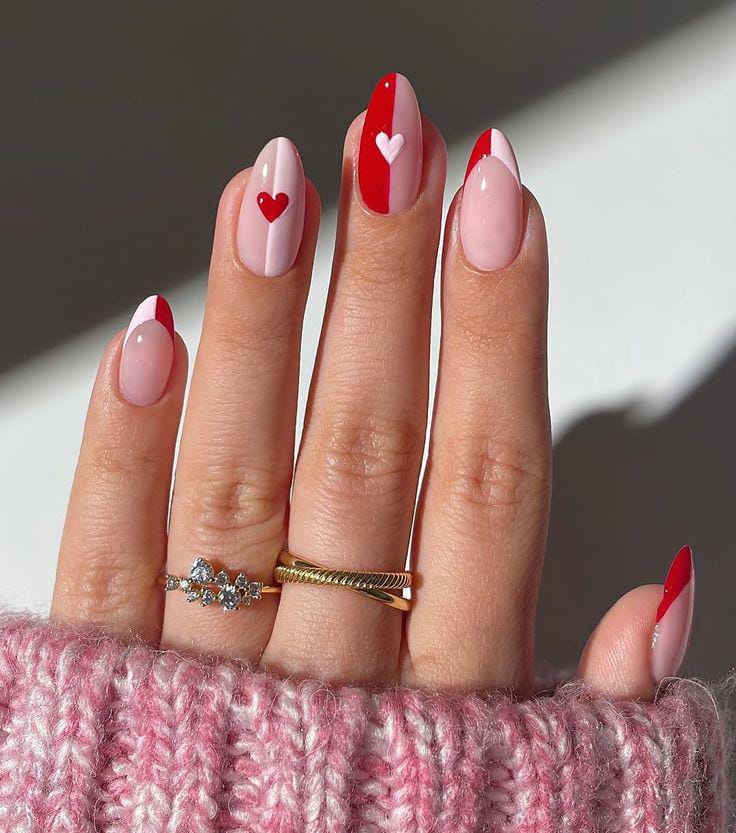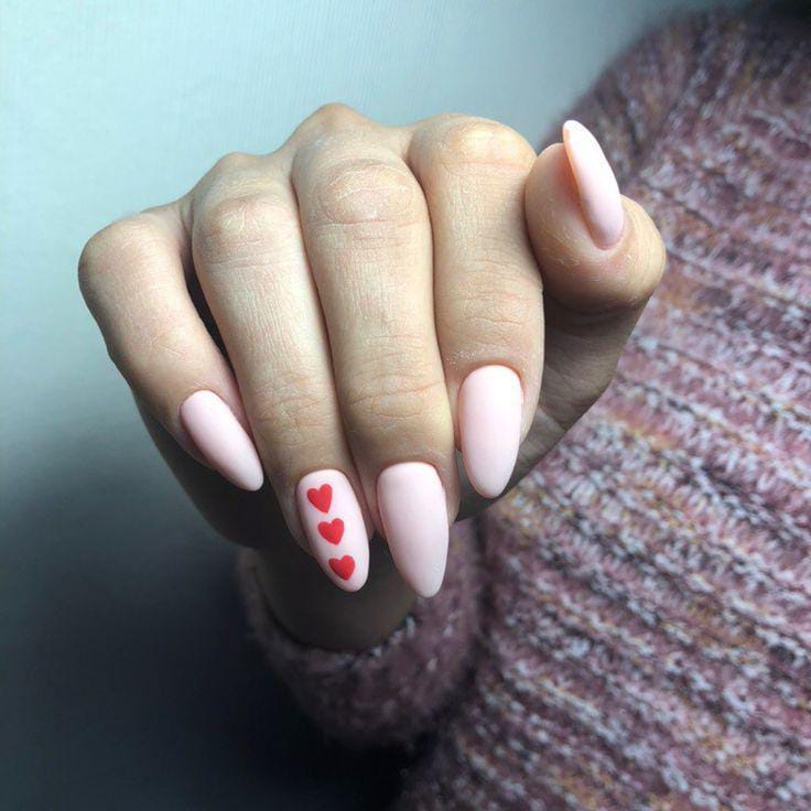 This design mixes nude, blush pink, and red tones with small heart details. It has a clean, cozy Valentine vibe with a minimal almond shape.