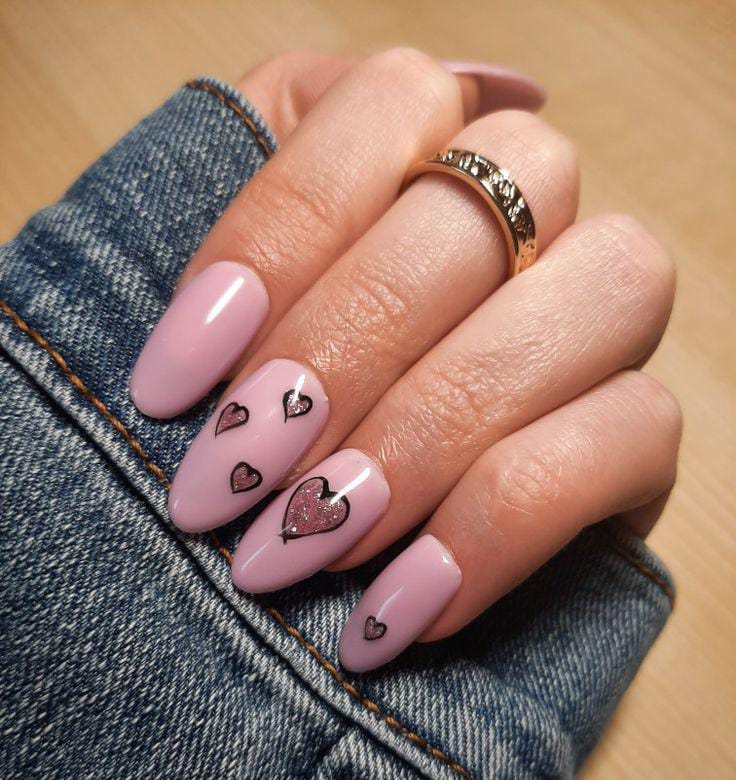 A mix of pastel lilac and soft pink creates a fresh and playful look. Small heart details with glitter add a cute Valentine touch without feeling too bold.